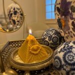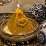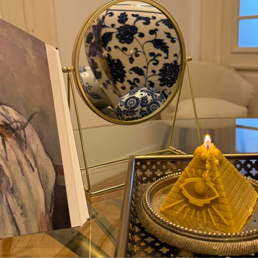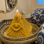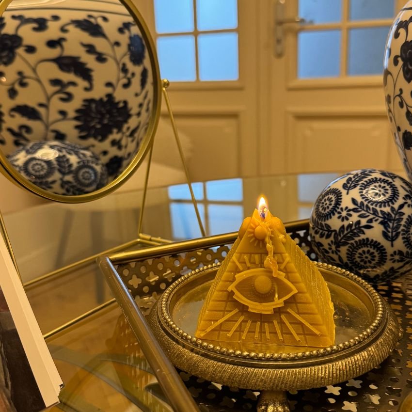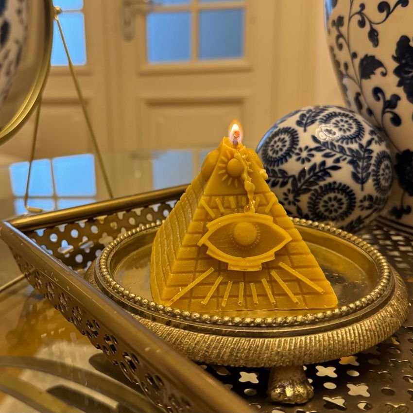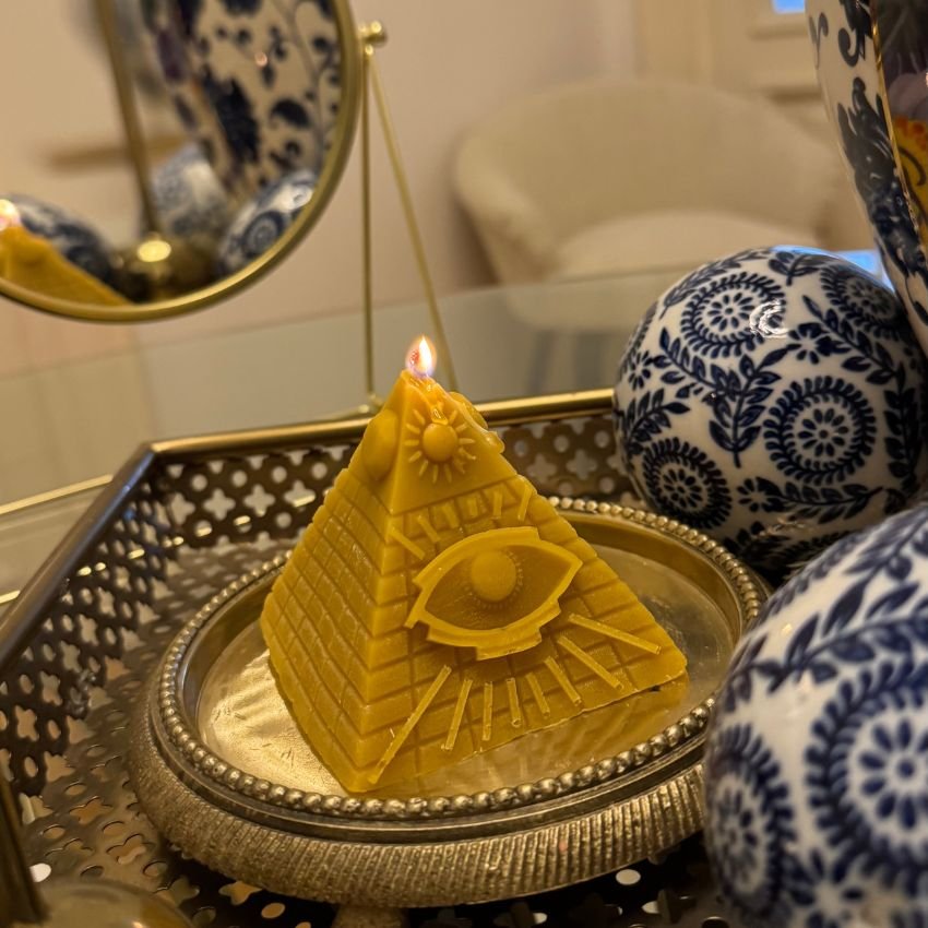 Inspirată de piramidele egiptene, în special cele de la Giza – simboluri ale trecerii în viața de apoi și ale conexiunii cu divinitatea – lumânarea în formă de piramidă reflectă:
